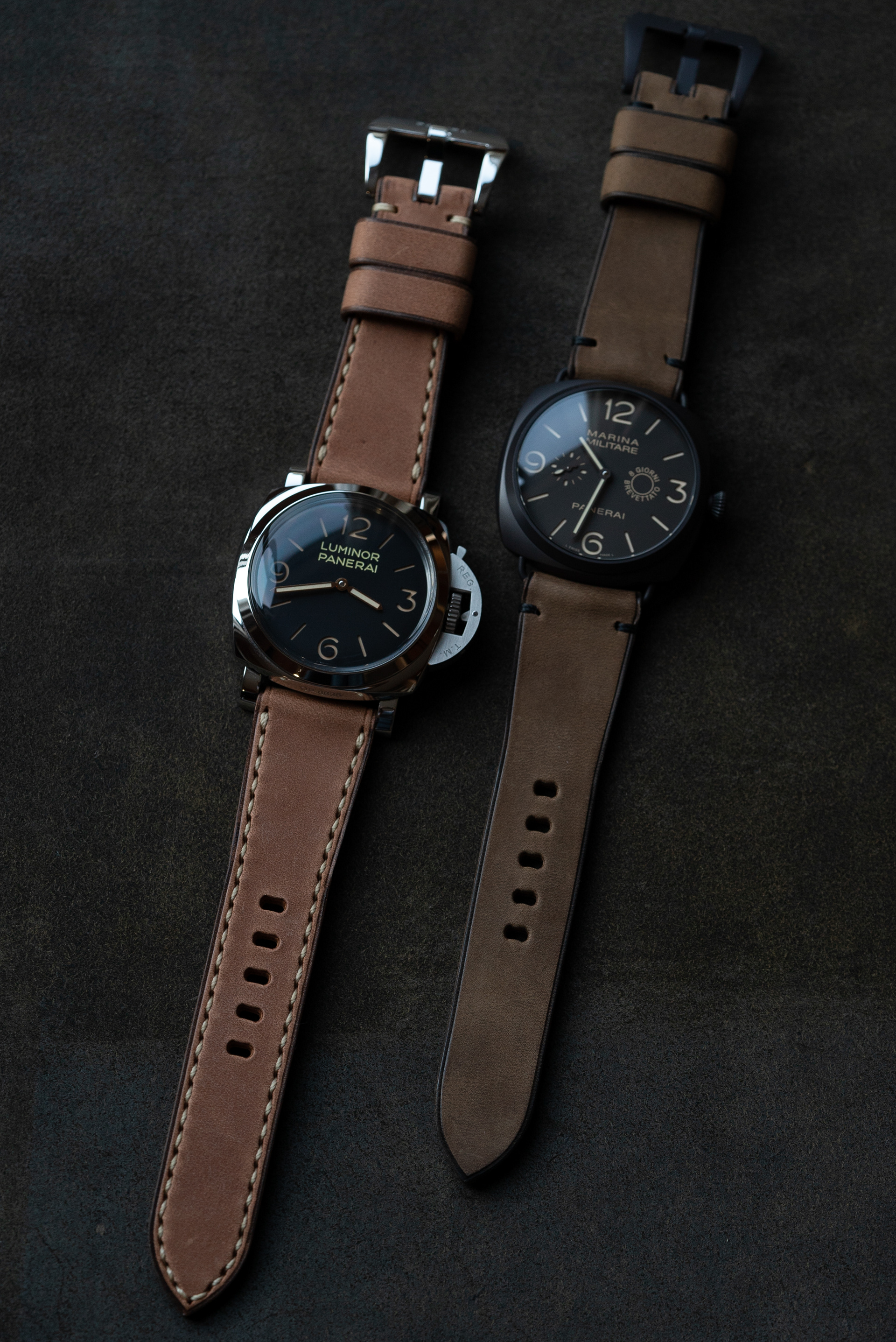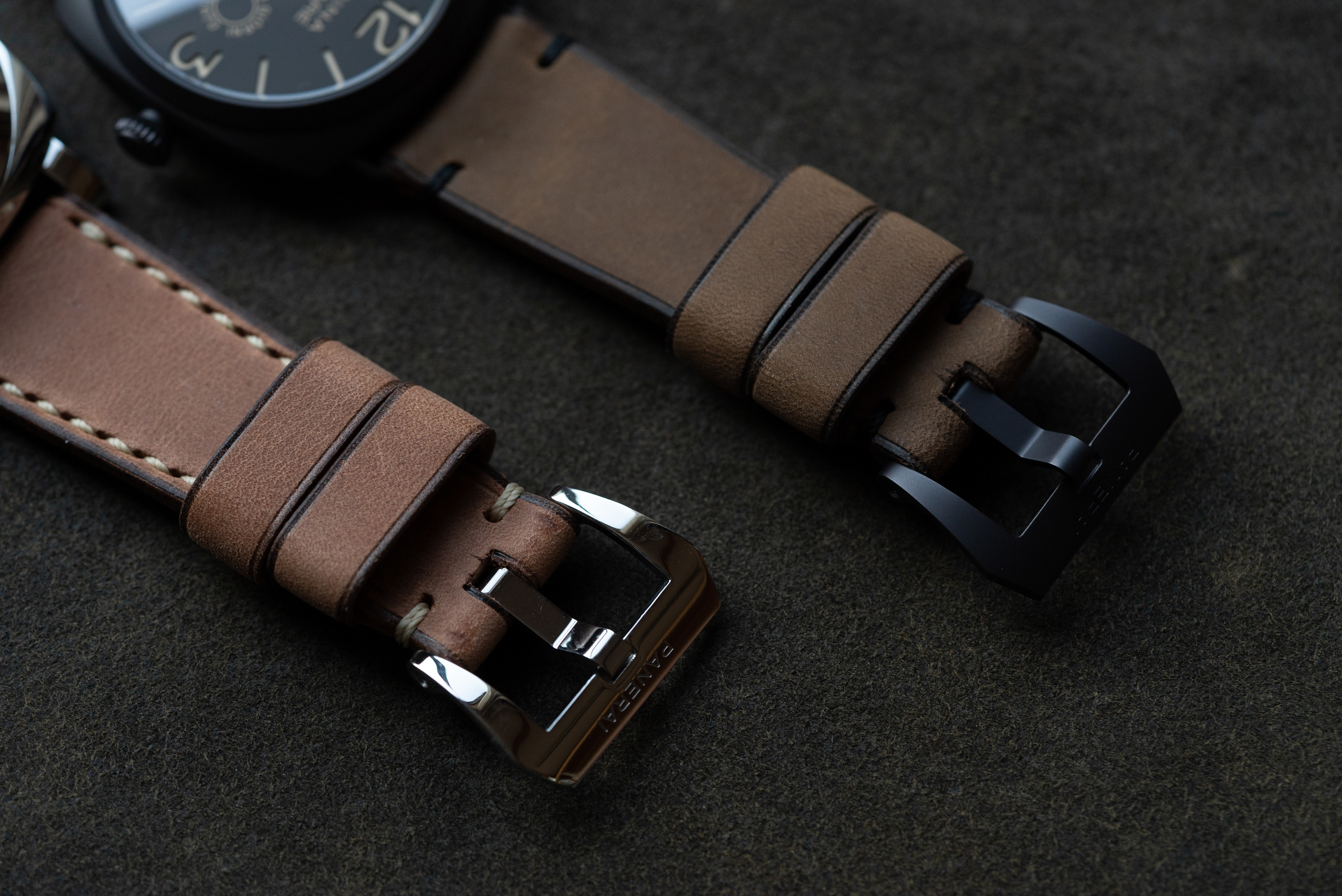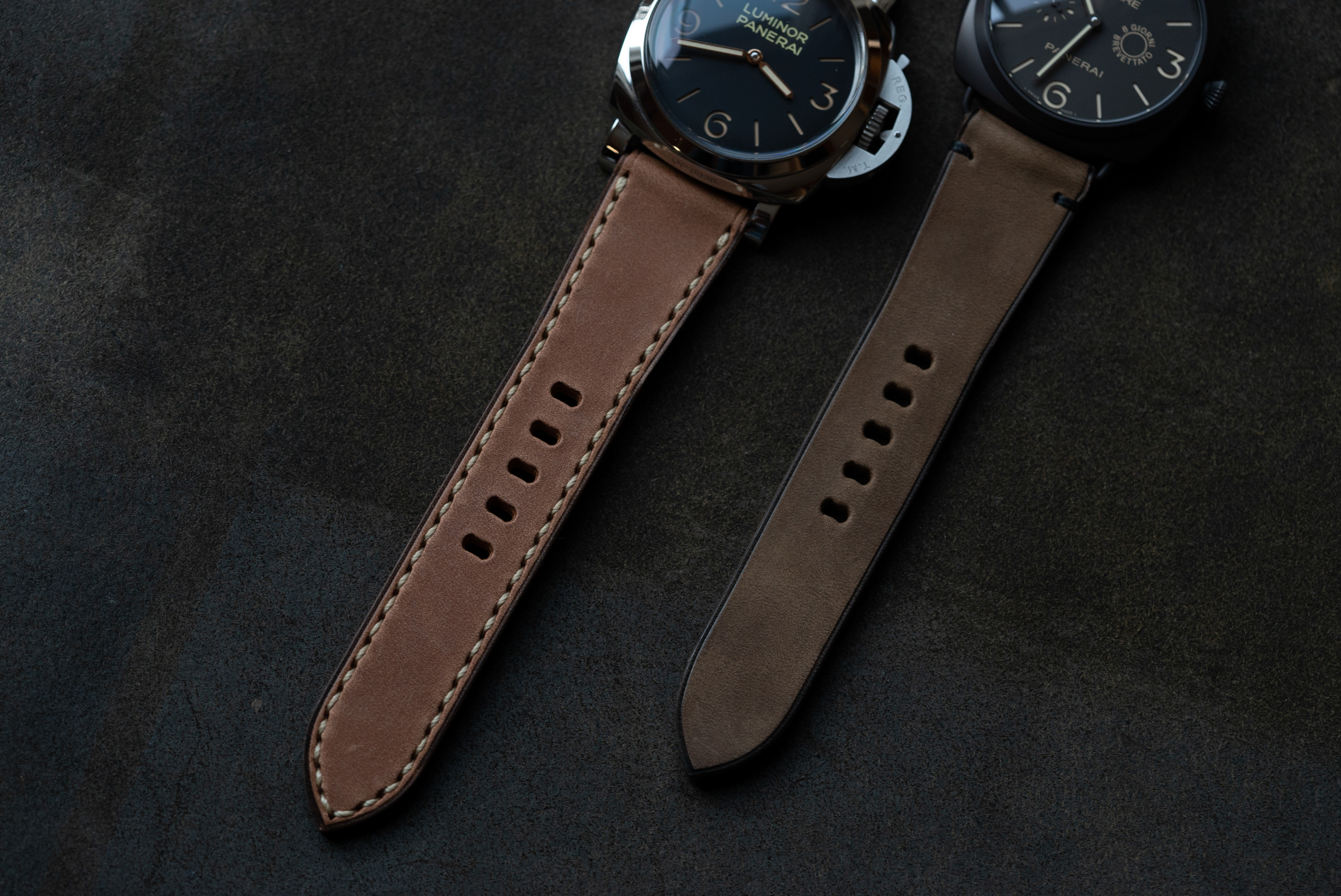 2つ共に微起毛牛ヌメ、ひとつはナチュラル色、もうひとつはカーキ色