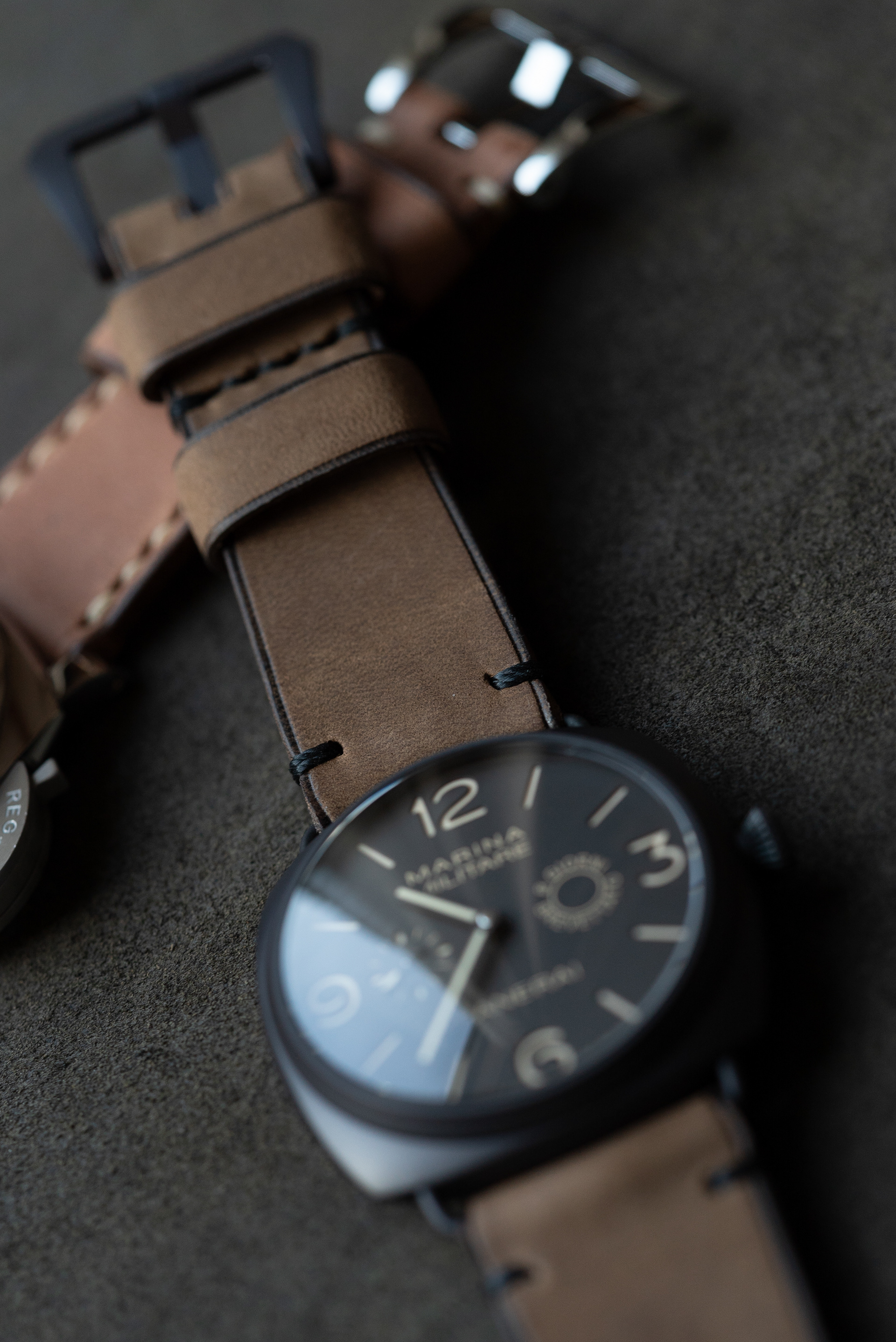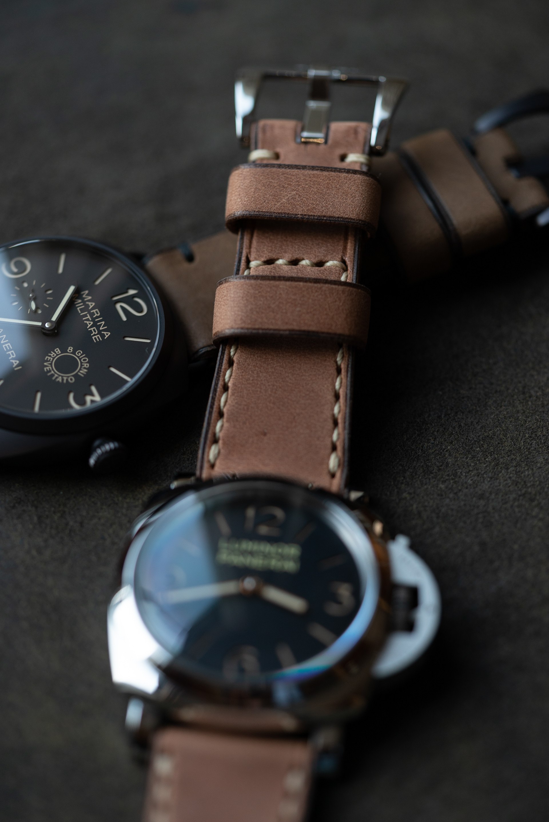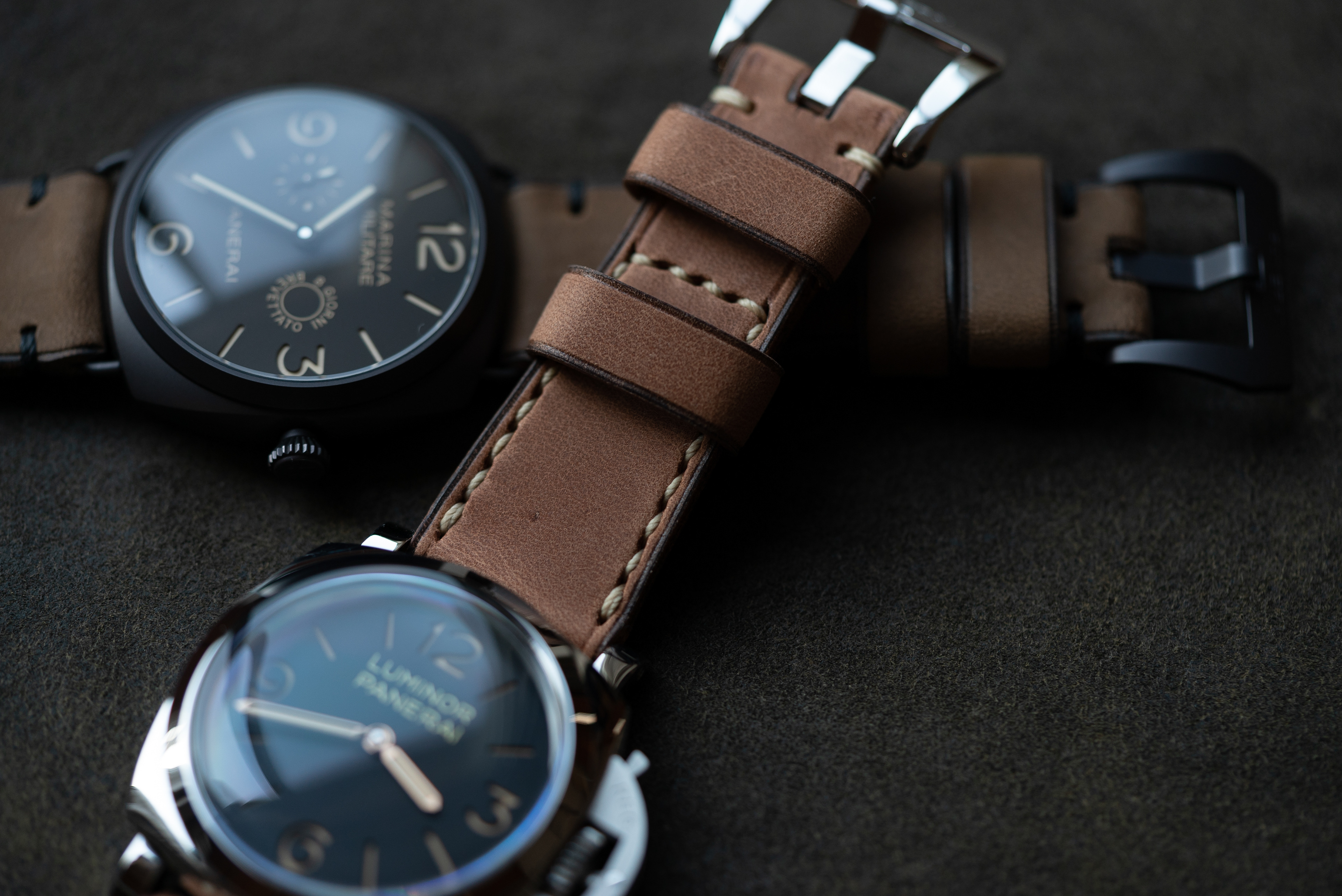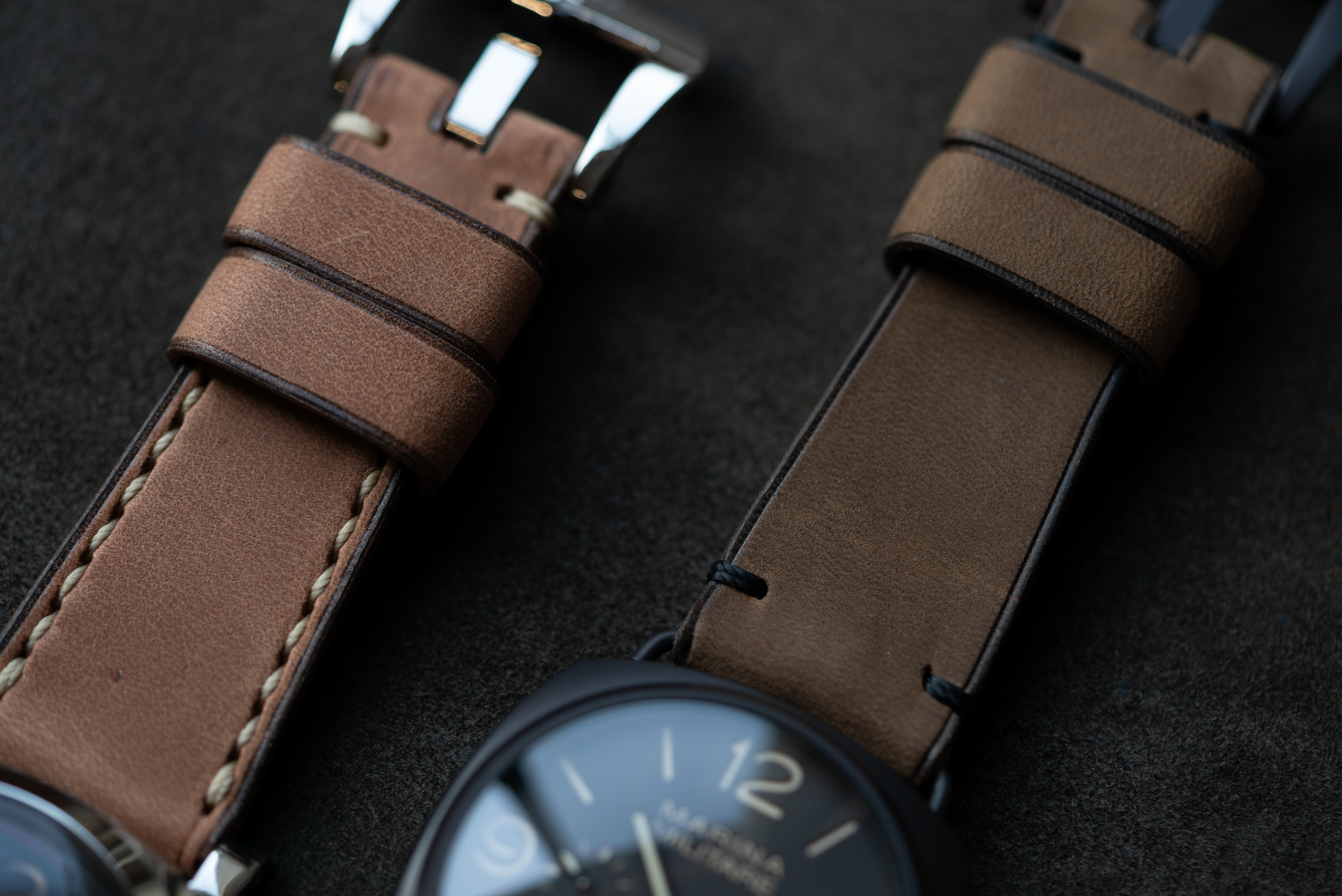 2つ共に微起毛牛ヌメ、ひとつはナチュラル色、もうひとつはカーキ色